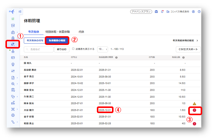 ①「休暇」を選択➡②取得義務の確認をクリックすると社員の一覧が表示されます