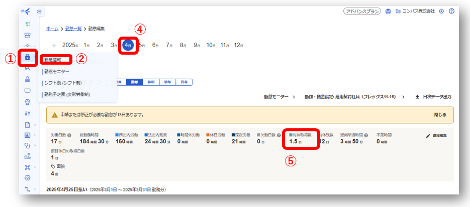 ⑤有給取得数が確認できます